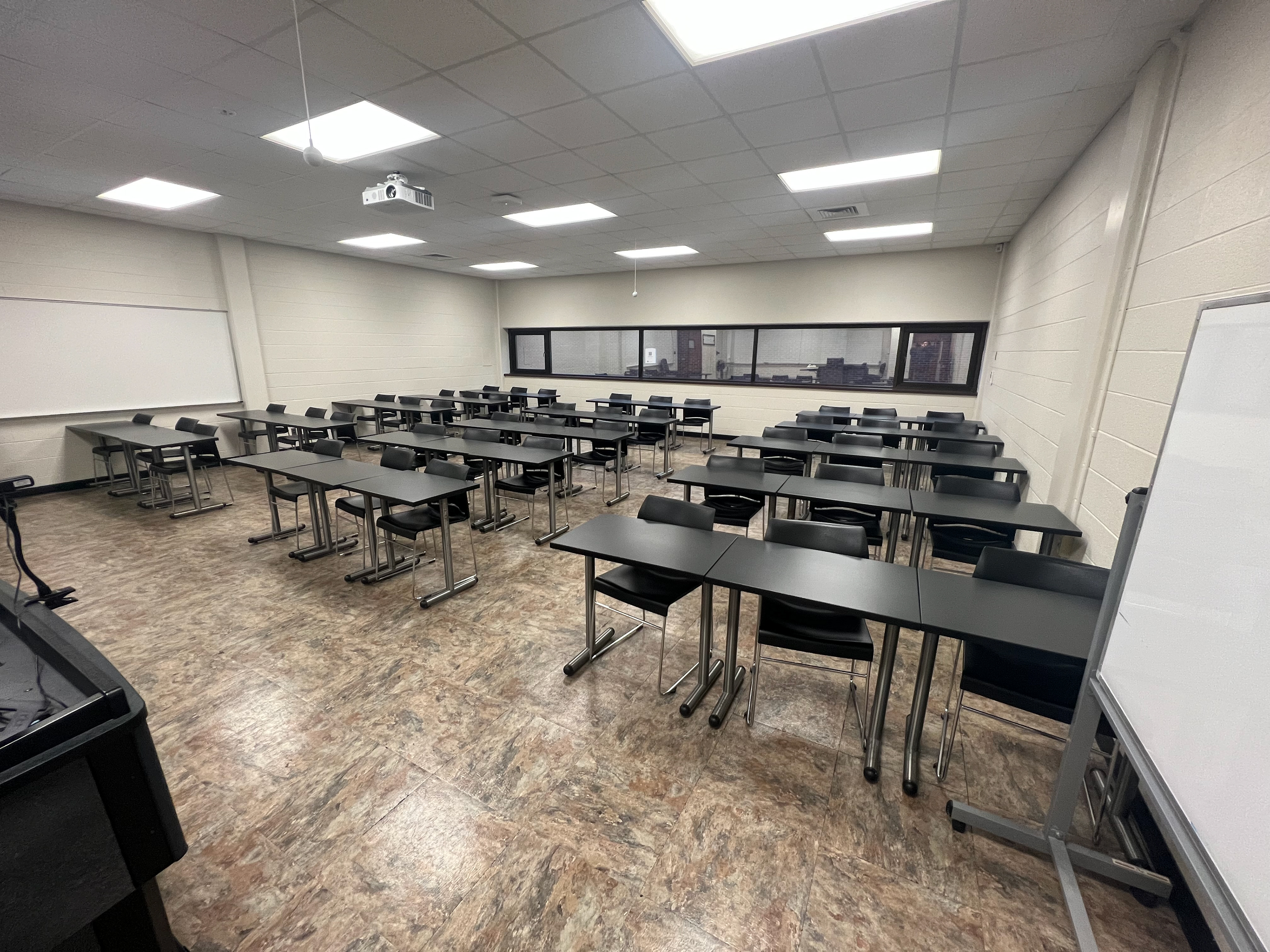 A new lobby addition was designed to serve two important purposes: creating an informal student study space and providing an accessible interior connection to the lower level of the adjacent lecture hall. Classrooms throughout the building were updated as collaborative, flexible learning environments with integrated lighting and technology. A smaller classroom was reimagined as a learning board room for use by both students and staff, while the lecture hall was fully renovated with new finishes, lighting, technology, and acoustical treatments. The project also introduced a larger Student Success Center tailored to the specific needs of the College of Business.